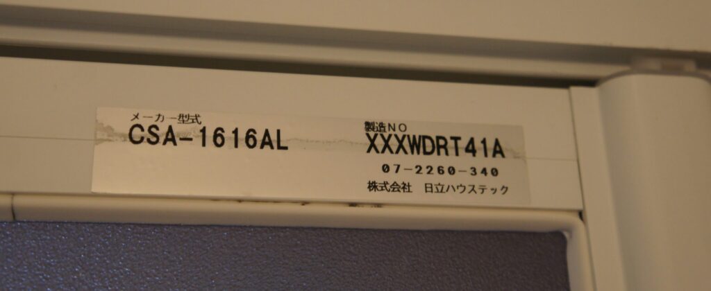 折戸の内側上部にメーカー型式と製造NOが記載されたシールが貼られています。